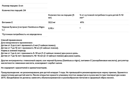 Другие ингредиенты: глюкозный сироп, сок черной бузины (Sambucus nigra), витамин С (аскорбиновая кислота), регулятор кислотности: лимонная кислота, консервант: сорбат калия.