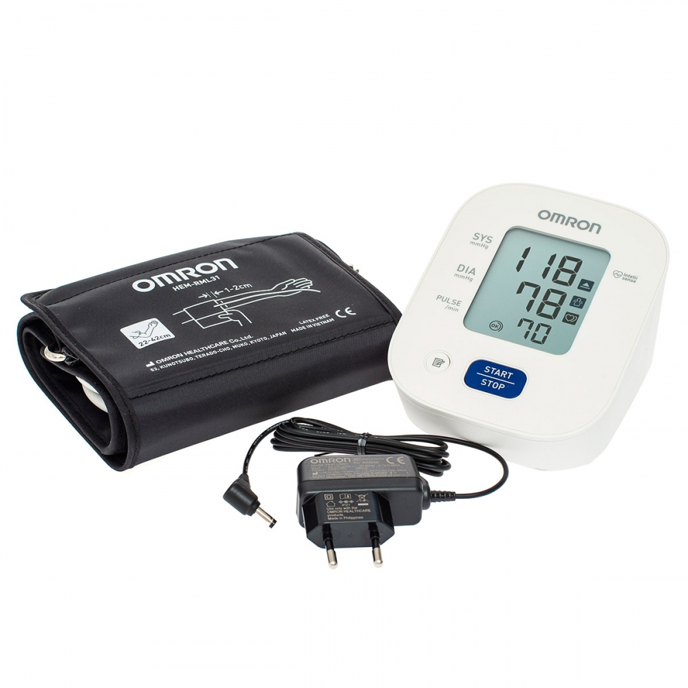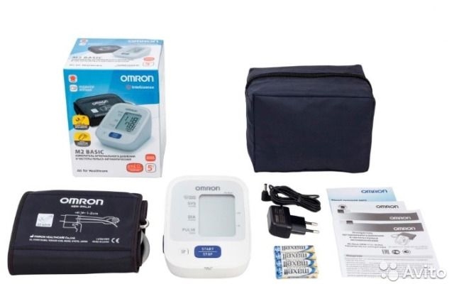 Комплектація: тонометр Omron M2+, універсальна компресійна манжета (розмір від 22 до 42 см), 4 батареї АА, мережевий міні-адаптер Omron S, інструкція з експлуатації російською мовою, журнал для запису артеріального тиску, сумка для зберігання та перевезення тонометрів та комплектуючих.